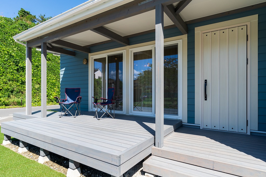 他のモデルよりも広めに取ったウッドデッキはもちろん屋根付きです。