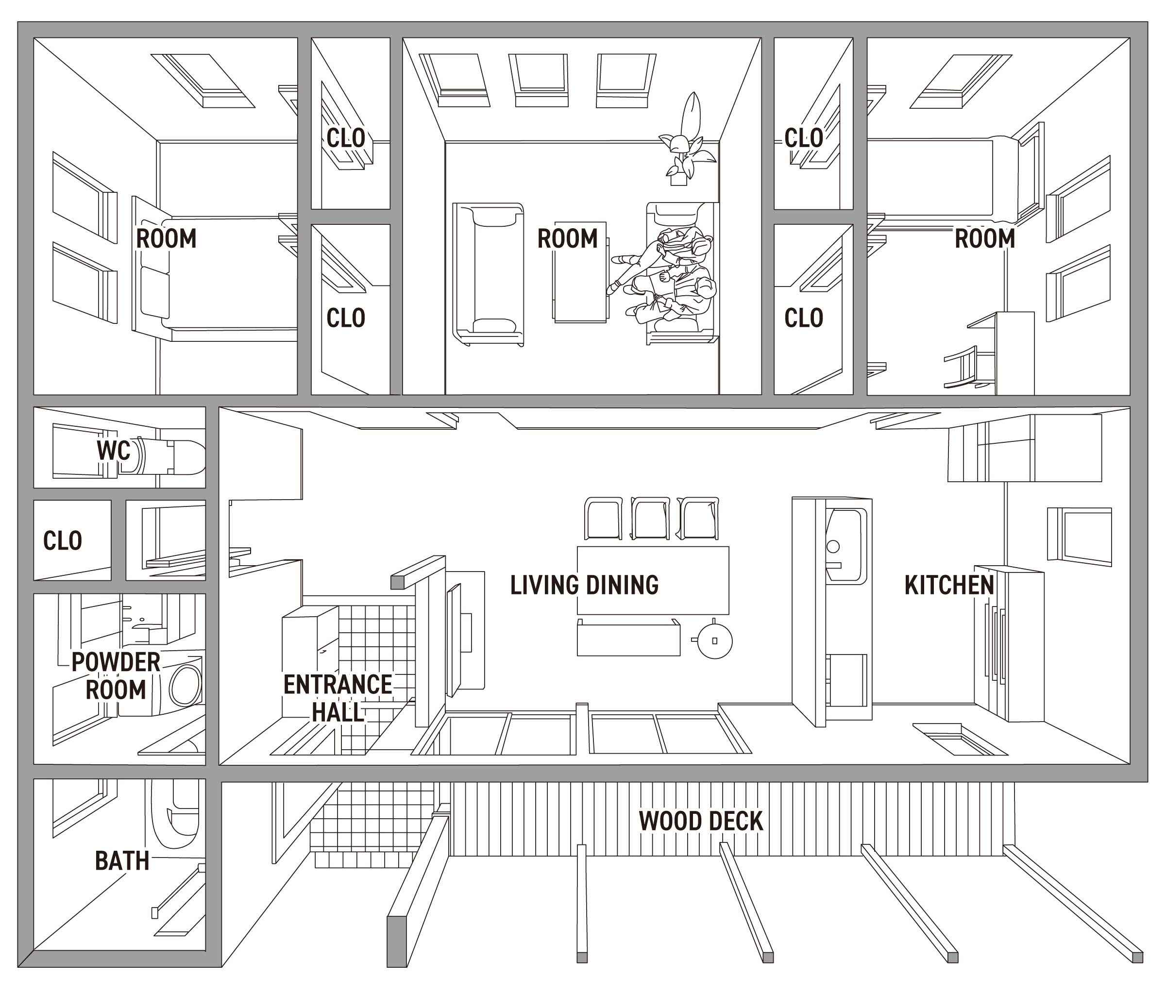 間取りから廊下を排除した空間が、大らかでシンプルにその時々の暮らしをハッピーにしつらえます。